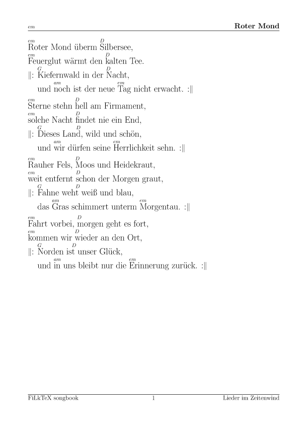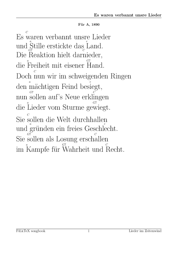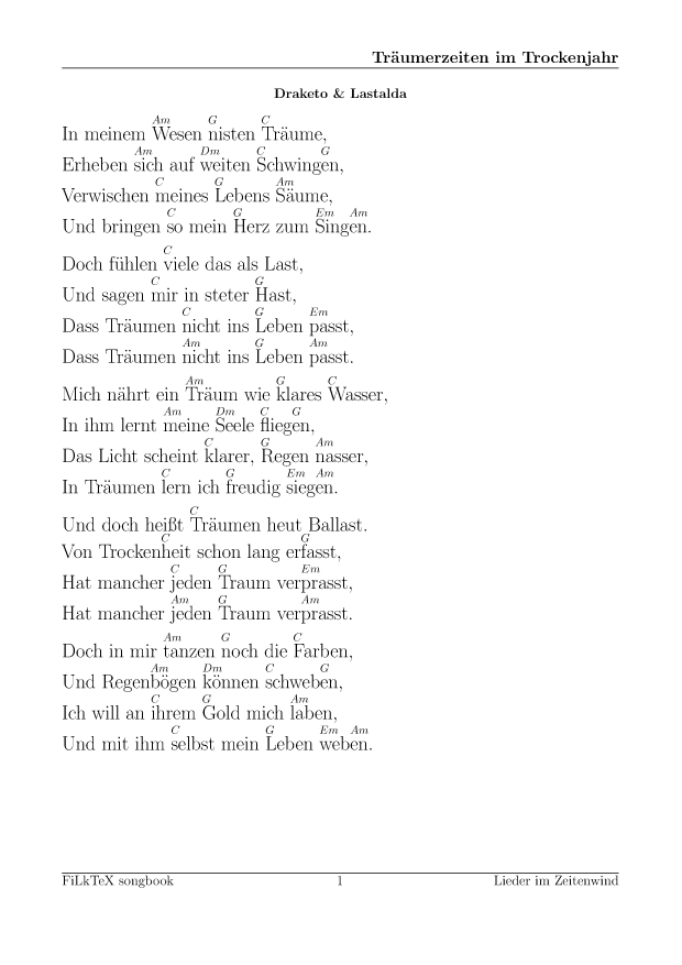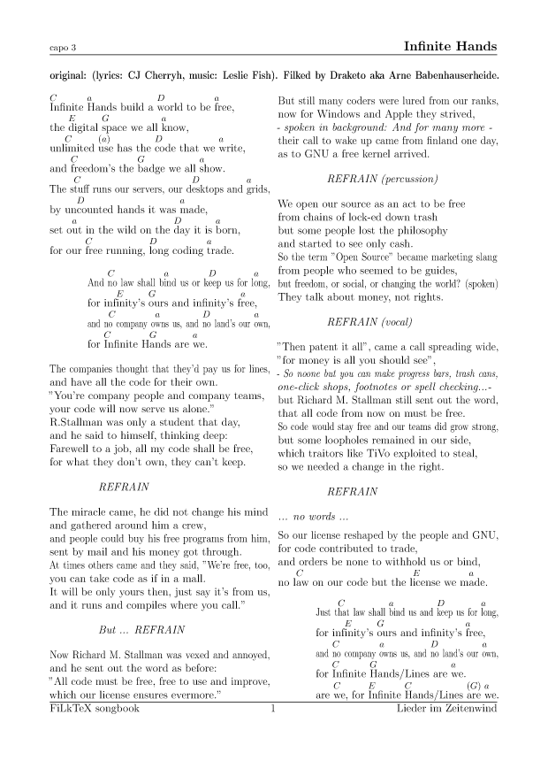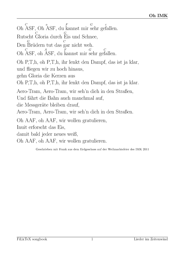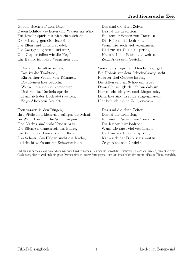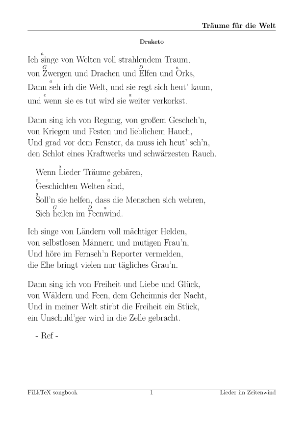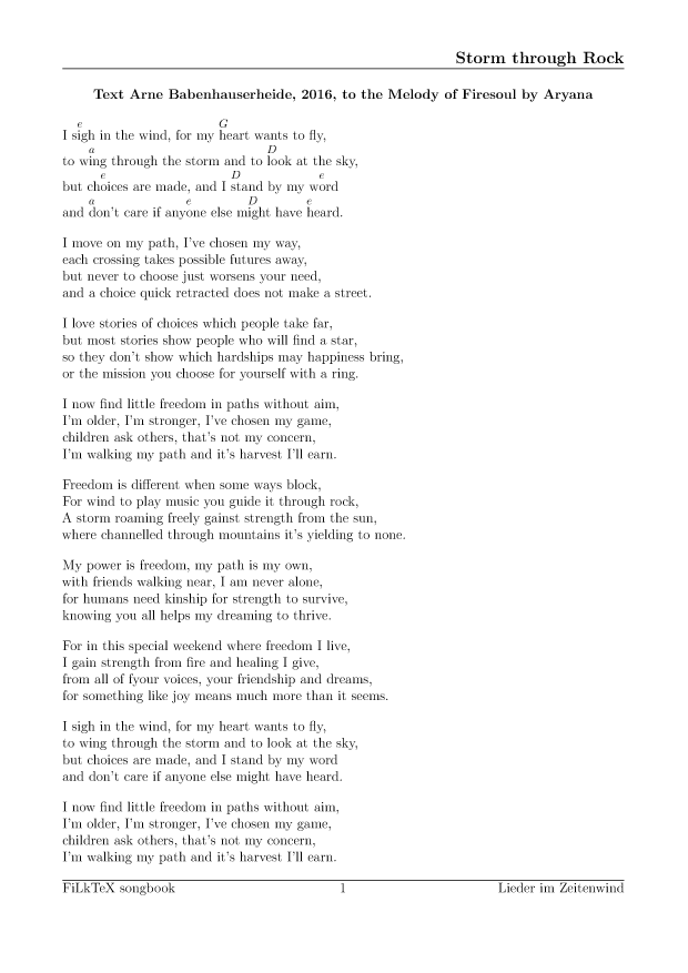 Anders als auf meiner alten Seite will ich die Lieder hier leichter nutzbar (und direkt druckbar) machen. Für alle Lieder hier gibt es die Quellen in meinem FilkTex Liederbuch Repository. Wenn ich keinen Namen dazuschreibe, ist das Lied von mir.