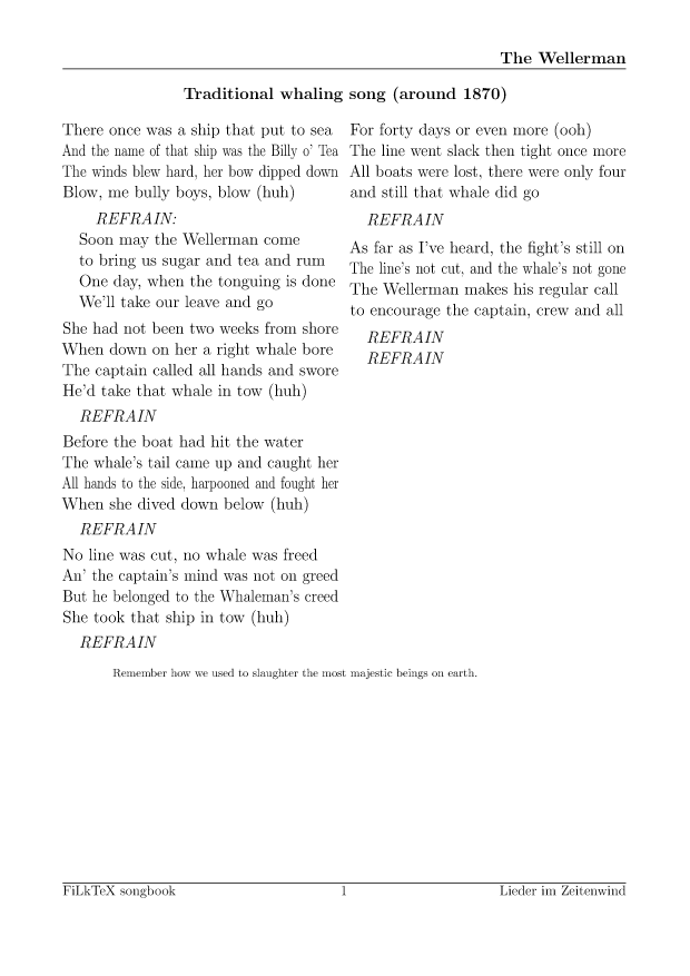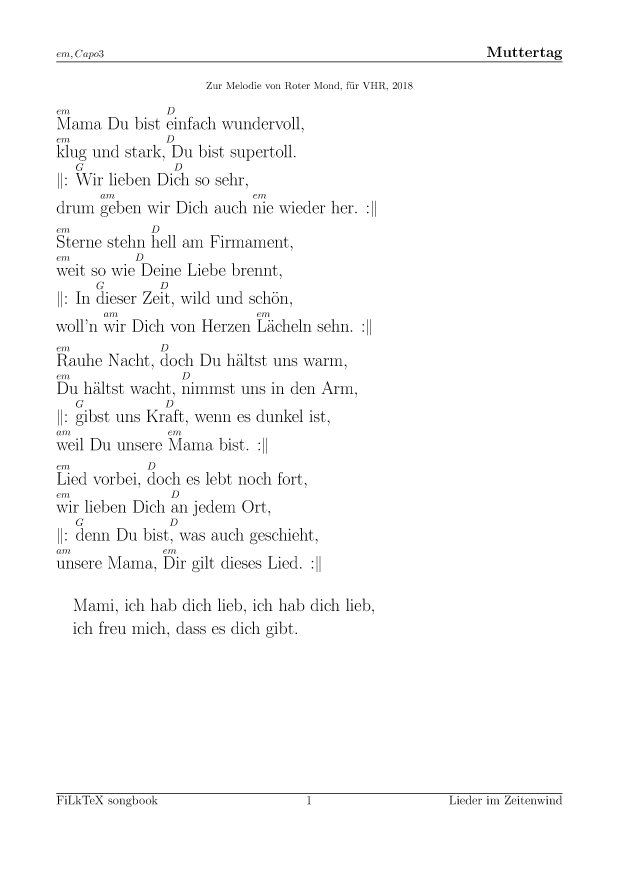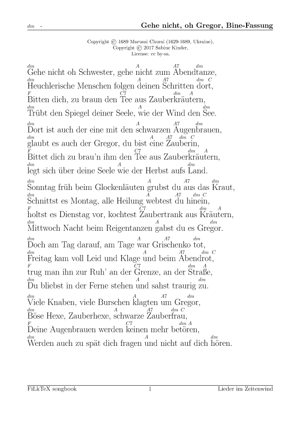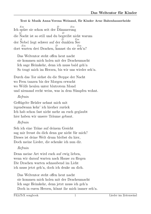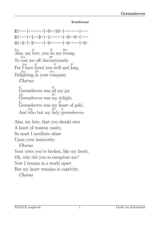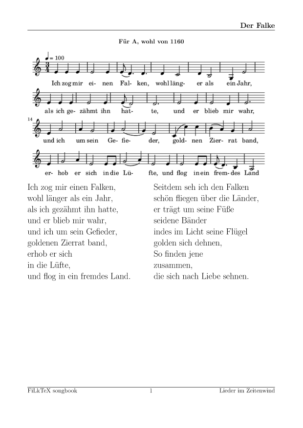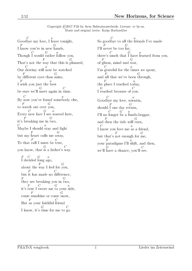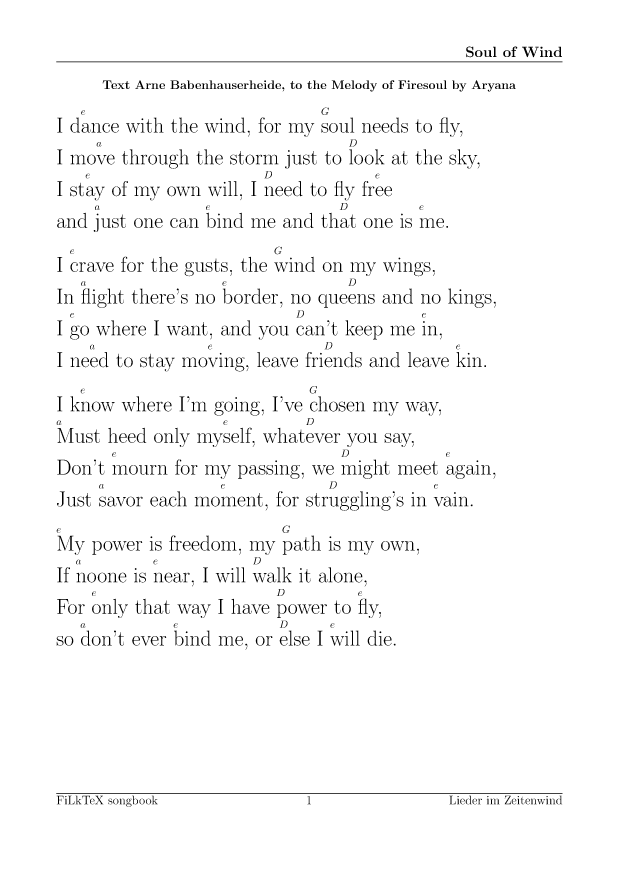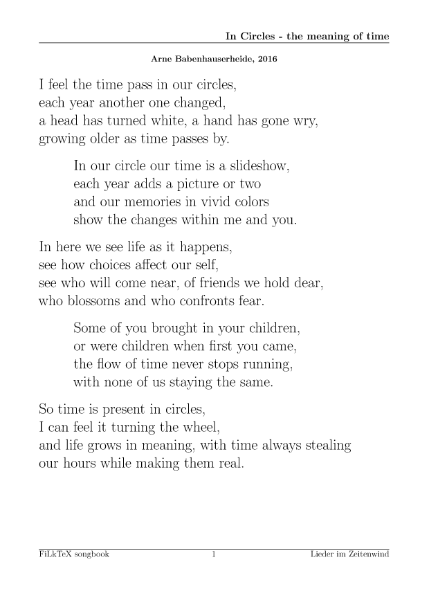 Anders als auf meiner alten Seite will ich die Lieder hier leichter nutzbar (und direkt druckbar) machen. Für alle Lieder hier gibt es die Quellen in meinem FilkTex Liederbuch Repository. Wenn ich keinen Namen dazuschreibe, ist das Lied von mir.